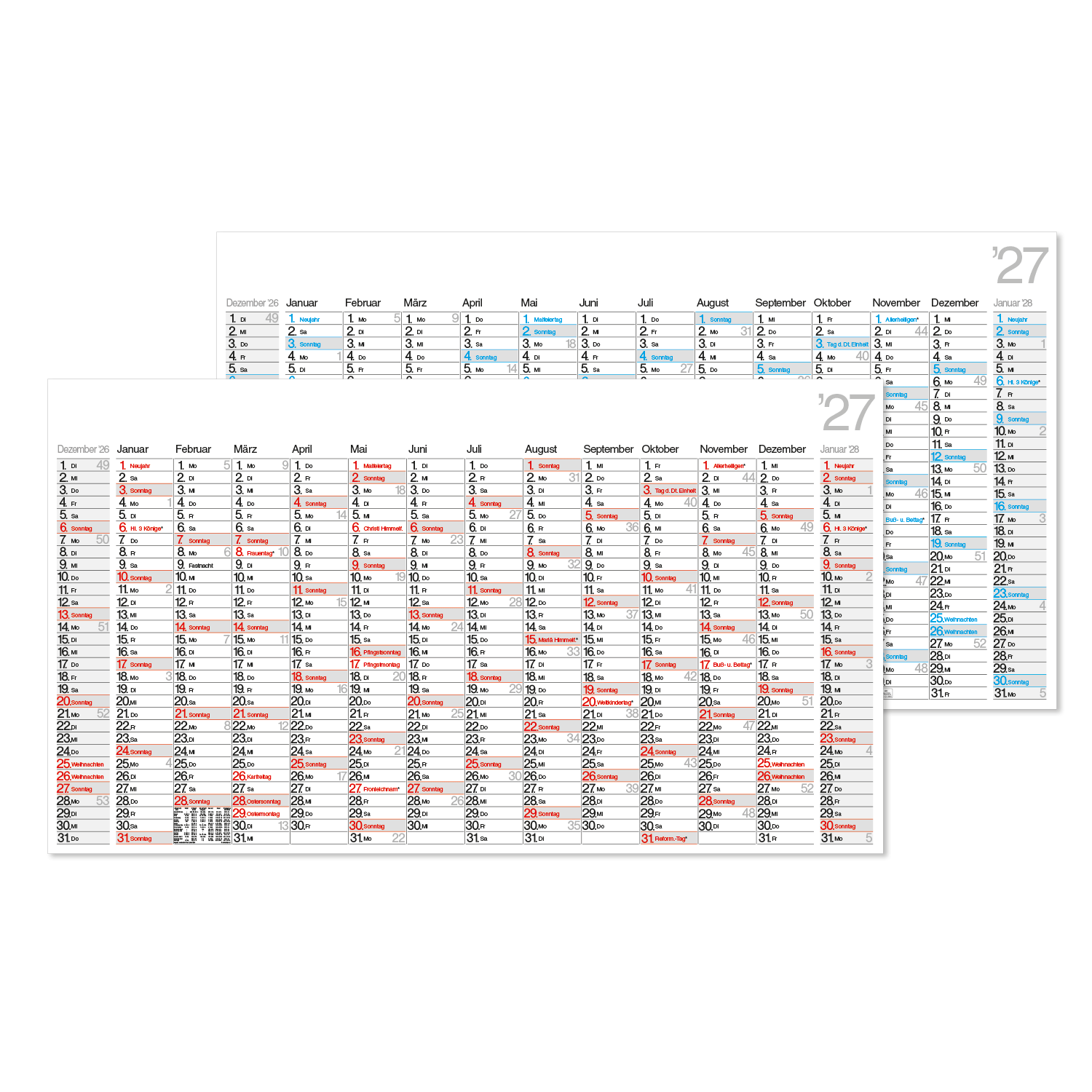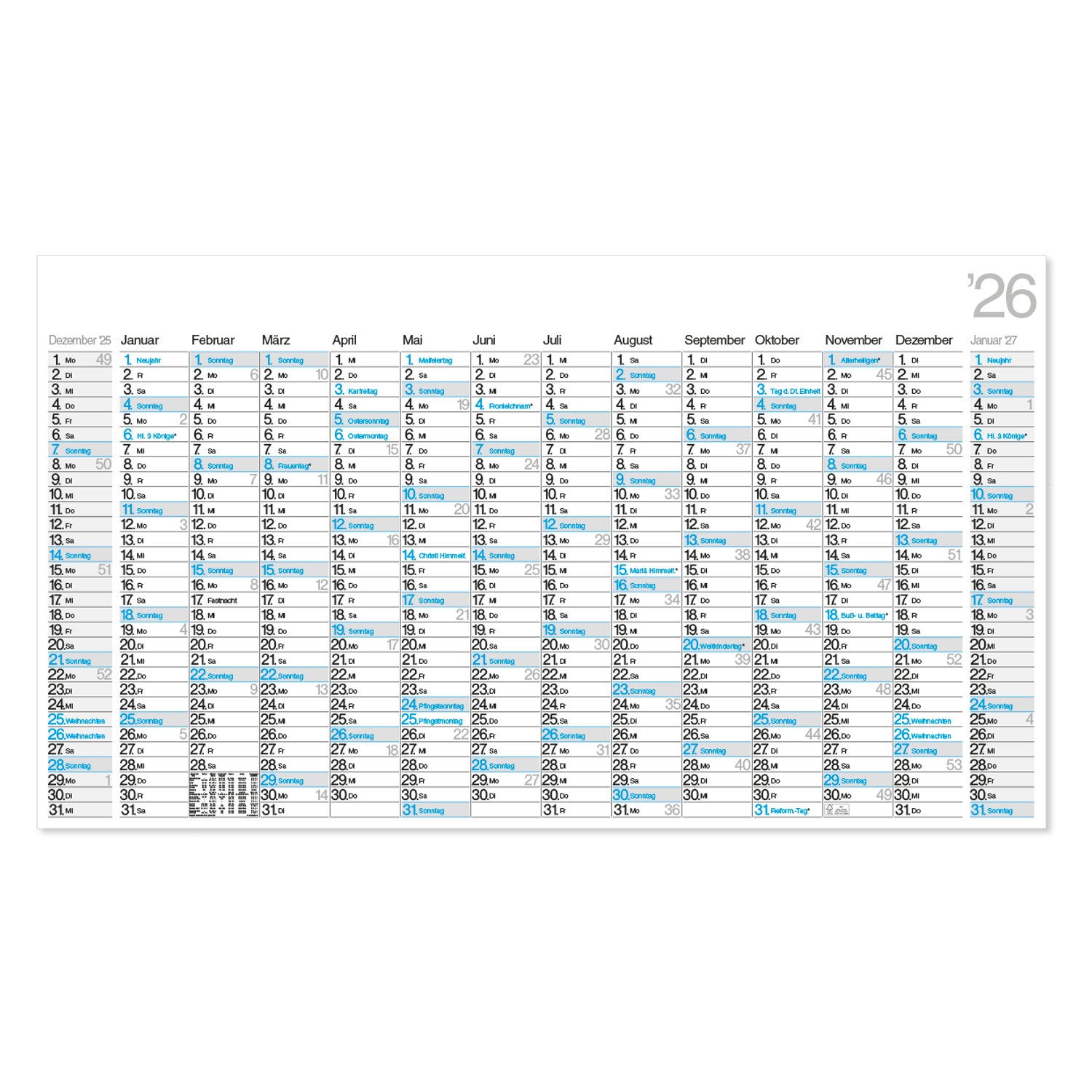 Die Sonntage sind grau hinterlegt, während Sonn- und Feiertage wahlweise in Rot oder Blau gedruckt sind. Die Wochentage erscheinen in Schwarz, wodurch der Kalender eine klare und gut lesbare Struktur erhält. Neben den ausführlichen Feiertagsbezeichnungen für Deutschland sind auch die Ferientermine aller Bundesländer enthalten – so behalten Sie wichtige Termine jederzeit im Blick.