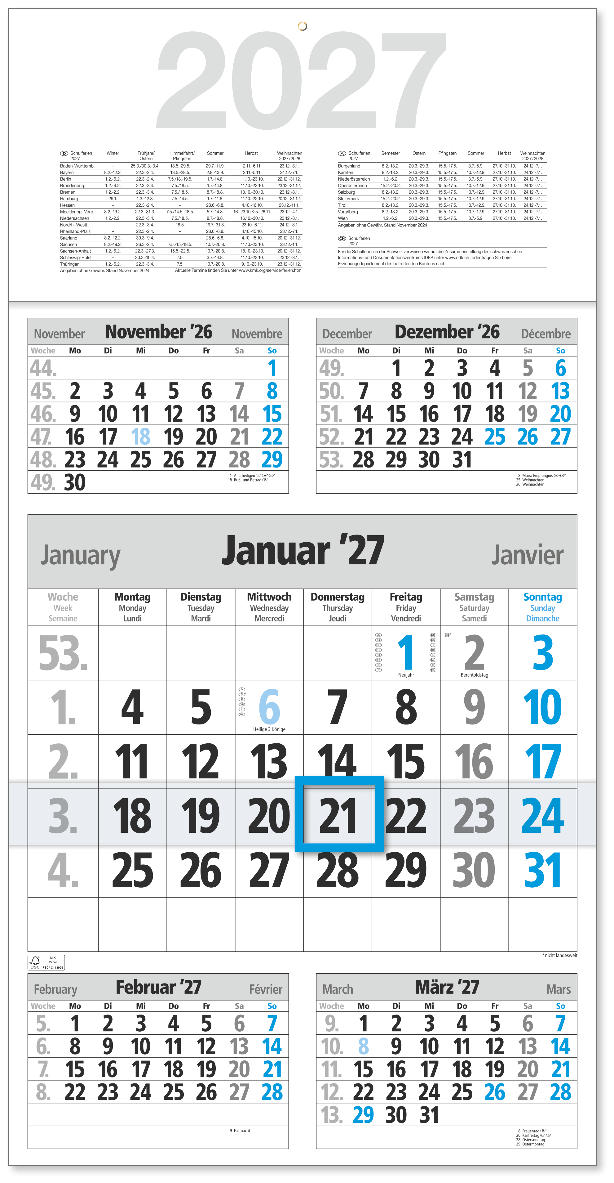 Wer viele Termine parallel im Blick behalten möchte, profitiert von einer klar strukturierten Übersicht. Dieser 5-Monatskalender zeigt einen zentral hervorgehobenen Hauptmonat sowie zwei Vor- und Folgemonate und schafft damit eine zuverlässige Planungsbasis für das Jahr 2027. Das übersichtliche Kalendarium mit Kalenderwochen unterstützt eine strukturierte Organisation im Alltag.