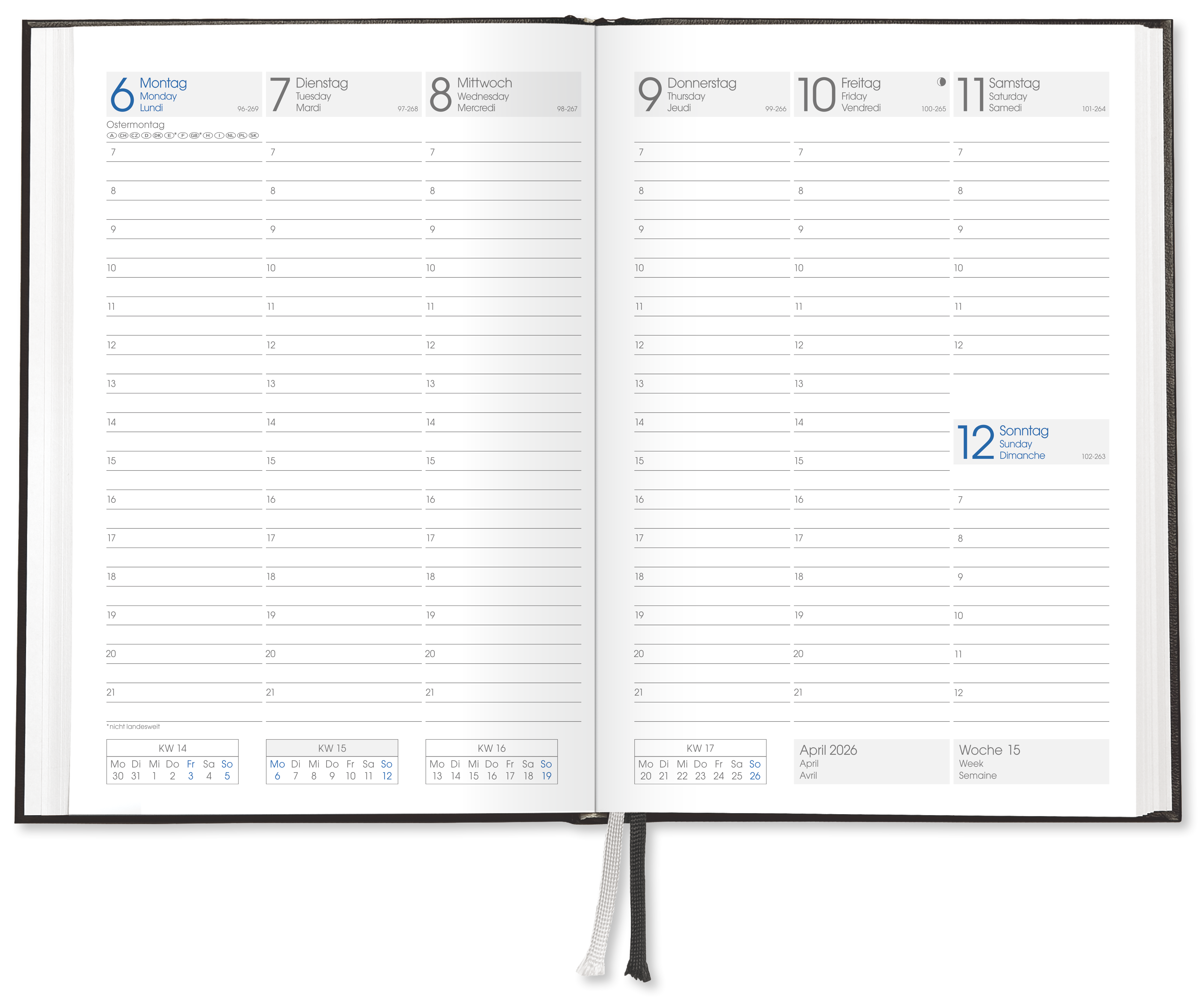 Die Sonn- und Feiertage sind wahlweise rot oder blau markiert, Werktage erscheinen in dezentem Grau. Jede Woche wird auf zwei Seiten dargestellt, ergänzt durch eine Stundeneinteilung von 7 bis 21 Uhr, um Termine strukturiert zu planen. Zudem enthält der Kalender Jahresübersichten für das laufende und das folgende Jahr, eine Ferienübersicht sowie einen Adressteil.